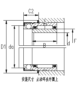 此組合式軸承可以承受徑向載荷及由密裝珠承受中等單向軸向載荷。這種節(jié)省空間的軸向可允許軸與軸之間距離非常小,中心距的最小尺寸就是軸承外徑的尺寸。軸承可以由外圈上的外止動環(huán)、軸承座孔臺肩或軸承座孔上的內(nèi)止動環(huán)支承以承受軸向載荷,如果兩套軸承彼此相向安裝,可以承受交變式的軸向載荷。